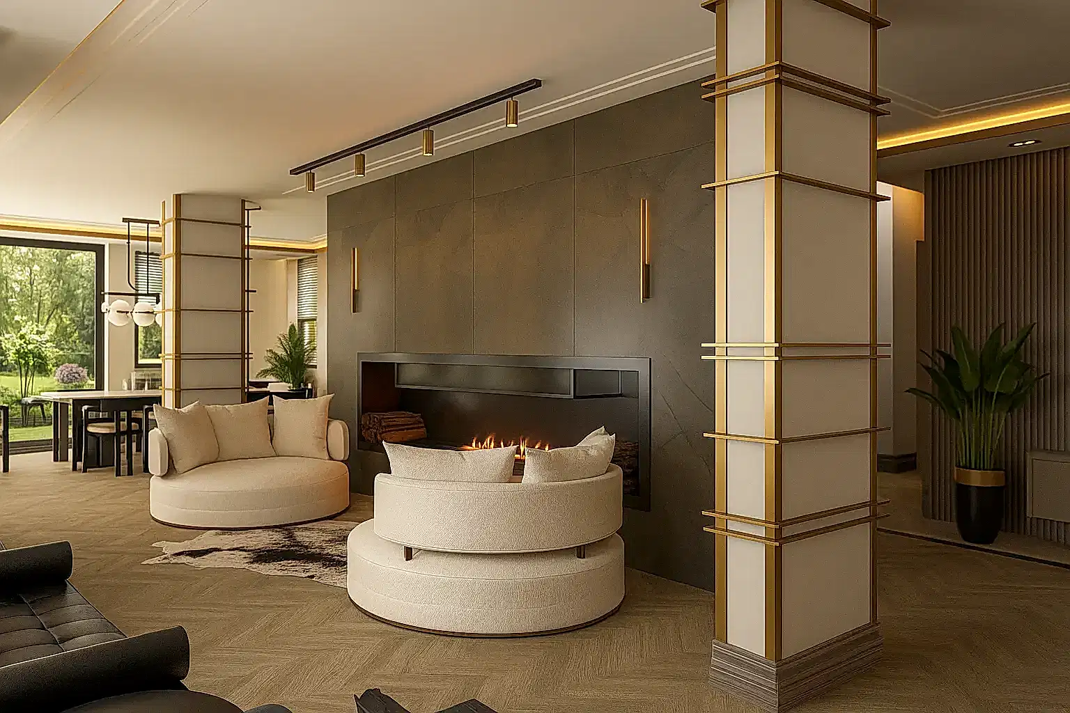 Sosyal yaşam alanlarında açık plan yerleşim, kullanıcıların bir arada vakit geçirmesini kolaylaştırırken; mekânın daha geniş, daha bütün hissedilmesini sağlar. Bu yaklaşım, özellikle Ankara villa iç mimarlık projelerinde iç-dış mekan geçişlerini yumuşatmak ve görsel süreklilik sağlamak açısından tercih edilir.