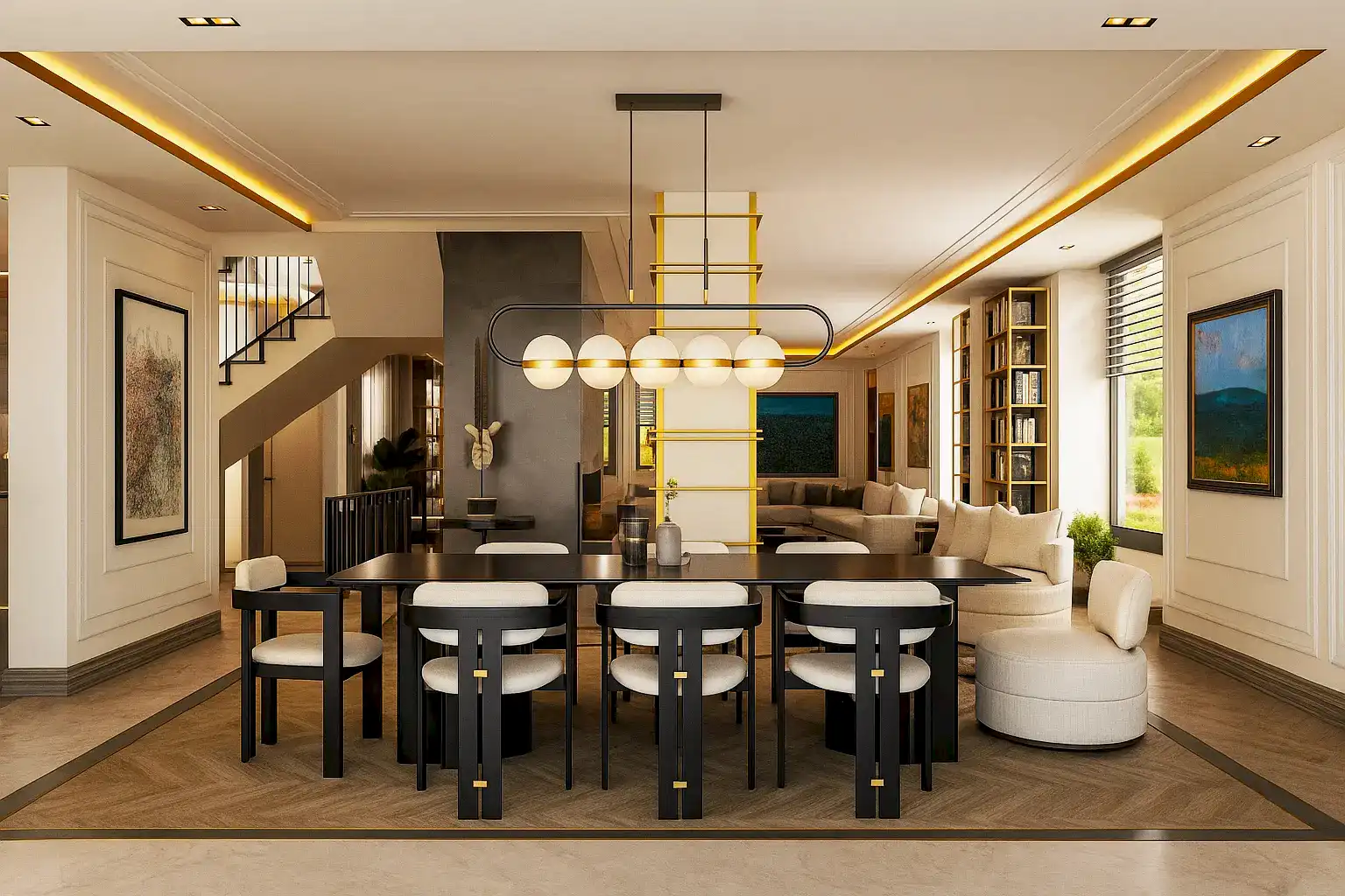 Bu projede yer alan oturma ve yemek alanı entegre planlanarak daha ferah bir atmosfer oluşturulmuştur. Modern çizgiler taşıyan mobilya tasarımları, yumuşak dokulu kumaşlarla konforu artırırken; dikkatle seçilmiş aydınlatma elemanları, alanın odak noktalarını vurgular. Duvarlarda kullanılan sanatsal tablolar ve mimari paneller, kişisel stilin zarif bir yansımasını sunar.