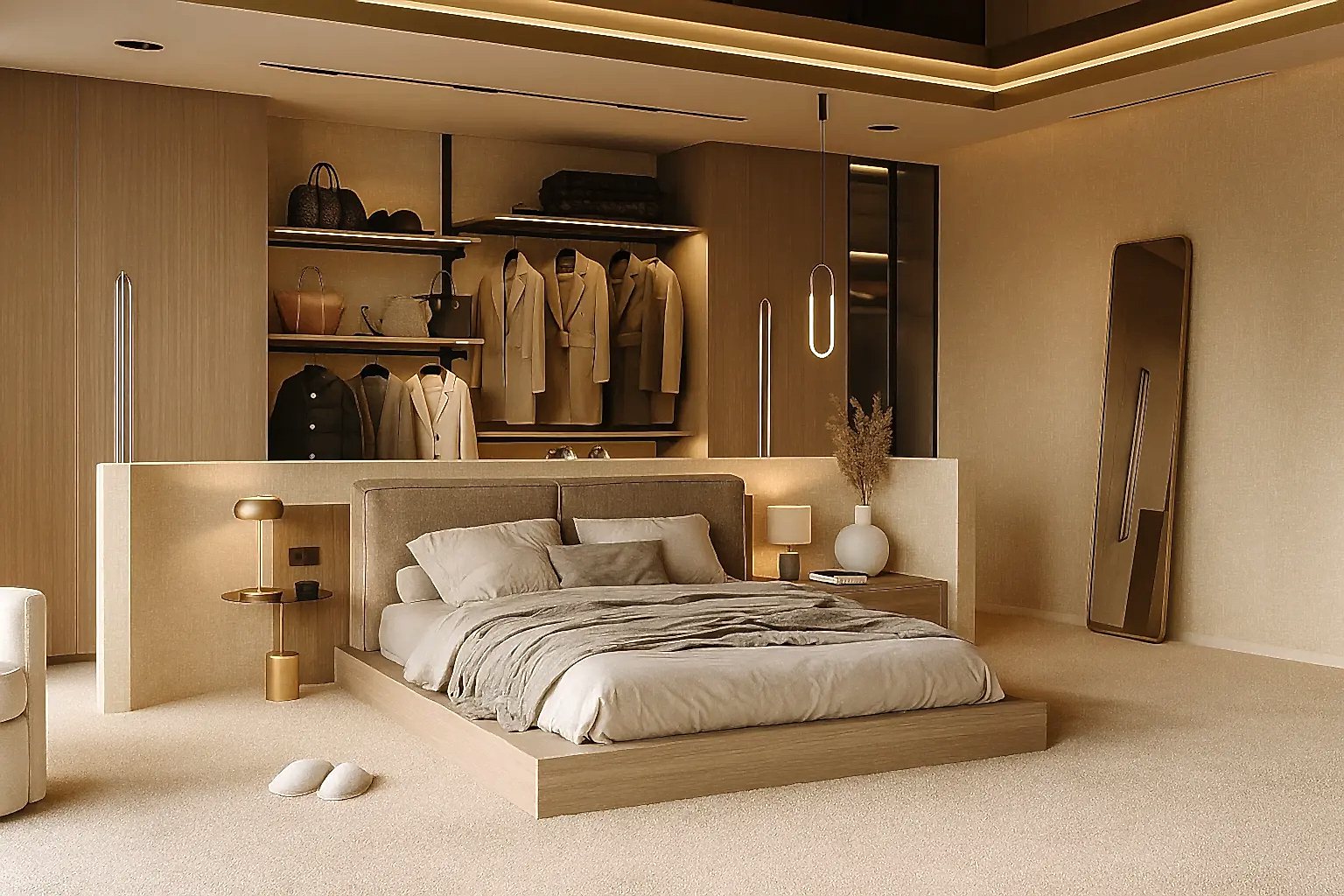 Ankara villa iç mimarlık projelerinde yatak odası tasarımı, sadece bir uyku alanı değil; zihinsel ve fiziksel olarak dinlenme alanı olarak ele alınmalıdır. Arsey İç Mimarlık olarak, yatak odalarında sade çizgilerle oluşturulan bir lüks algısı hedefliyoruz. Sessiz renk paletleri, doğal dokular, yumuşak aydınlatma ve dokunsal malzeme seçimleri sayesinde dingin ve huzurlu mekanlar yaratıyoruz.